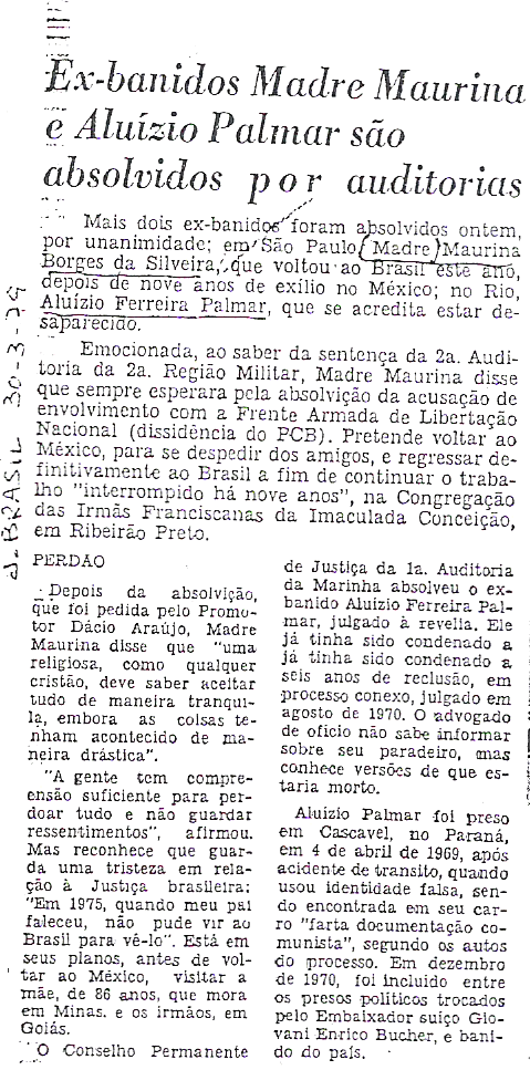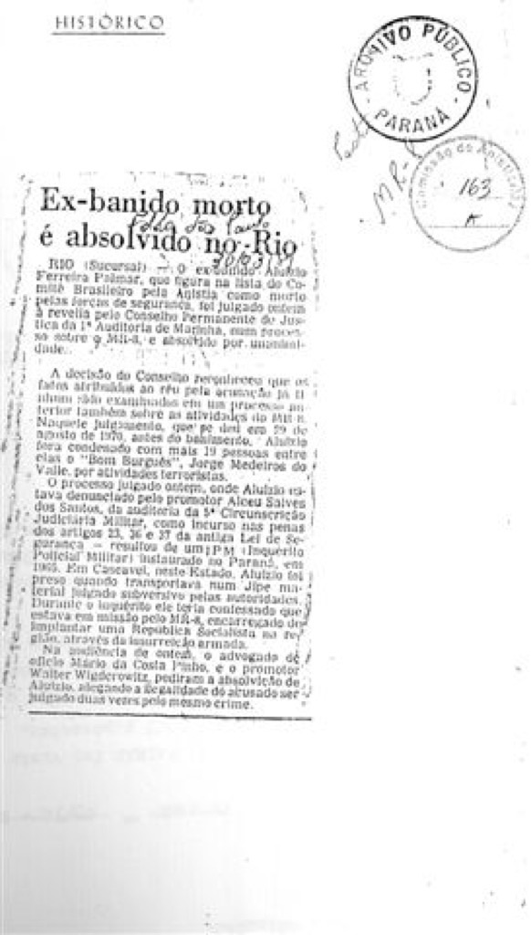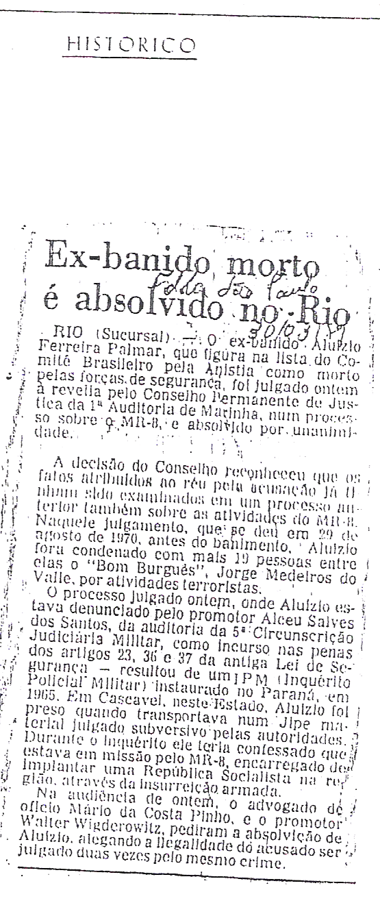 DITADURA ANUNCIOU MORTE DE ALUÍZIO PALMAR EM JORNAIS DO RIO E SÃO PAULO